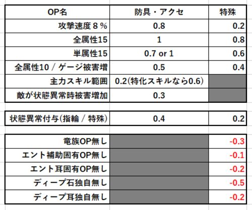 105Lv環境におけるオプションの評価値について おおよそ特殊カスタムのスキル攻撃5%を基準値1とした相対的な評価になります。 固有OP/状態異常時スキ攻5% 状態異常ダメ20%以下時、スキ攻/被害増などは1換算 大前提としてスピードブーツ装備を想定していま…