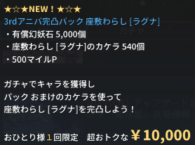 万能キャラカケラ60個が月間1個限定5000円です。