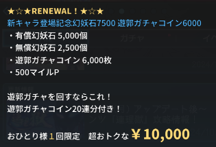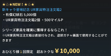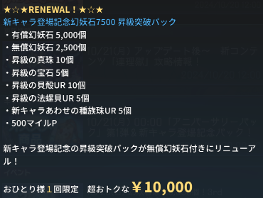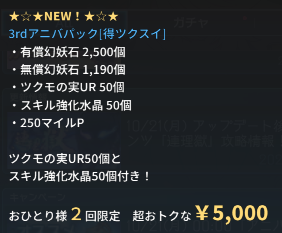 新規キャラ実装時に売っている超絶ツクモ水晶パックが半額になりました。